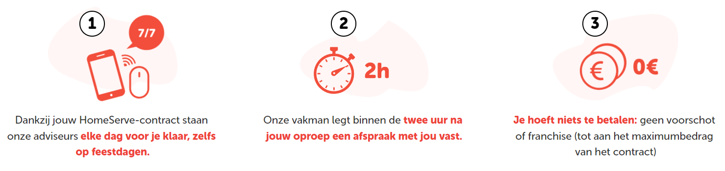 In geval van nood, één telefoontje naar onze helpdesk, open 24u/24 en 7d/7, en HomeServe regelt alles!